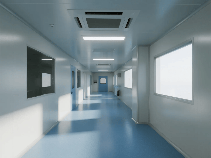 圍護(hù)系統(tǒng):50mm厚醫(yī)療級純白彩鋼板,表面采用納米銀離子抗菌涂層(抗菌率≥99.9%),所有接縫處采用R30mm圓弧一體化處理;