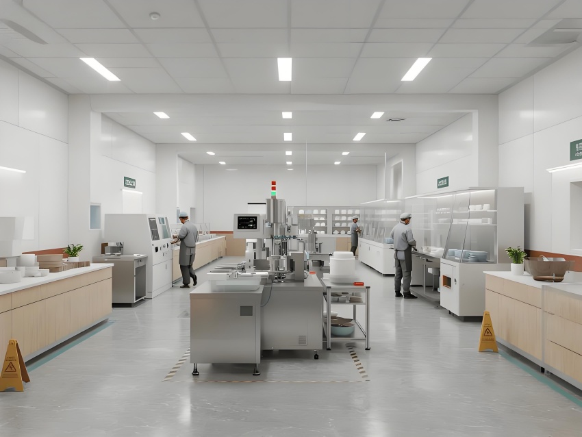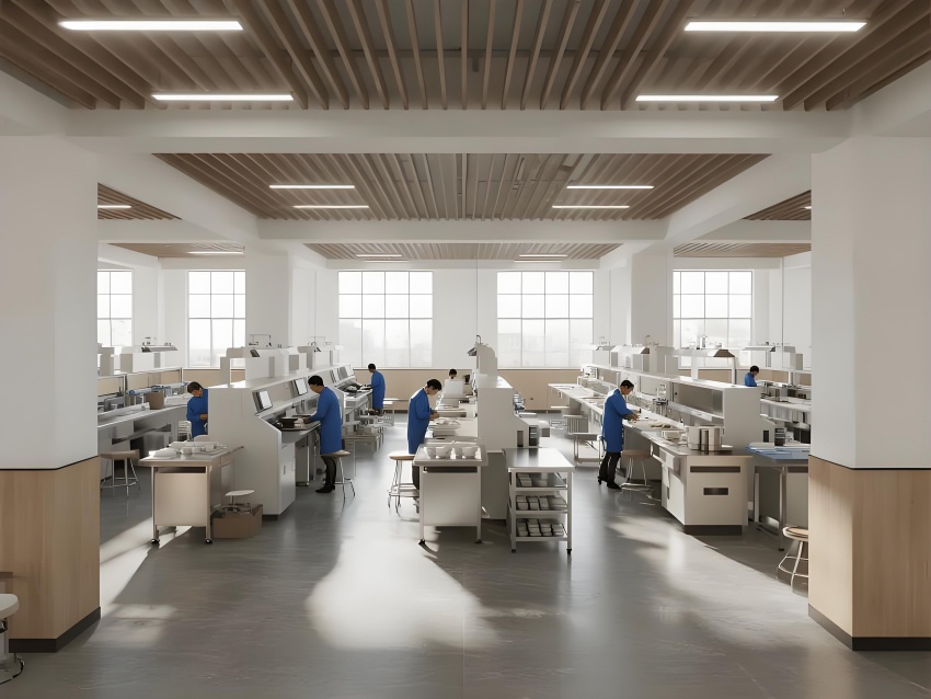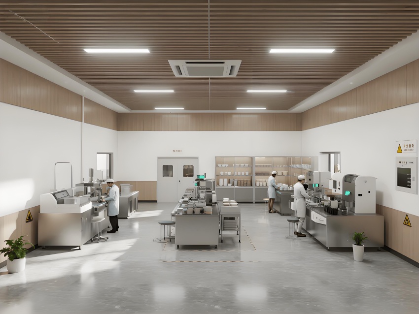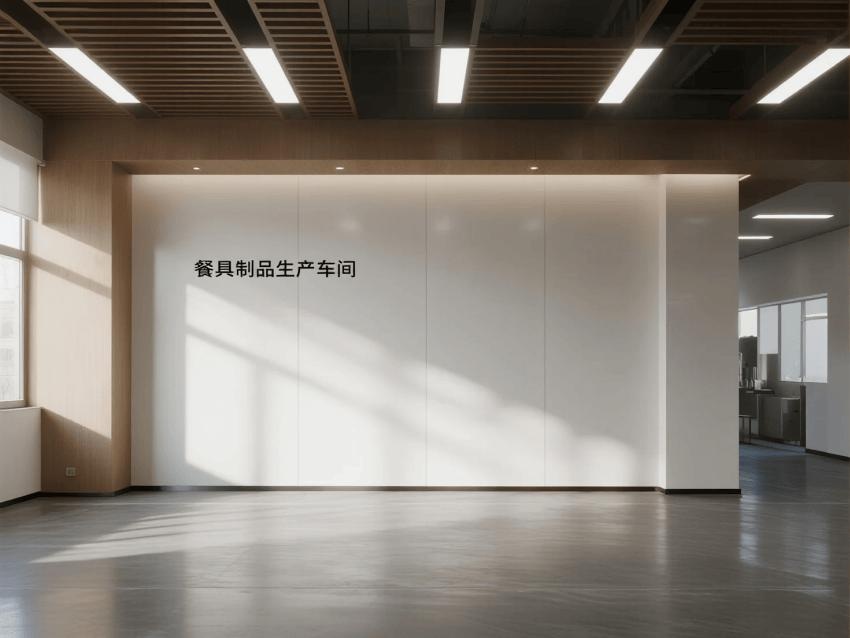 本餐具制品車間設(shè)計(jì)以現(xiàn)代簡約工業(yè)風(fēng)為核心,融合高效生產(chǎn)與視覺舒適性。色調(diào)以純凈白(墻面)、淺木色(倉儲(chǔ)柜)和不銹鋼銀灰(設(shè)備)為主,營造清爽專業(yè)的氛圍。