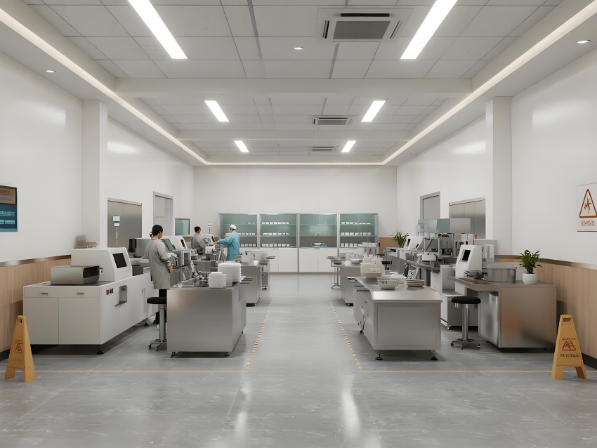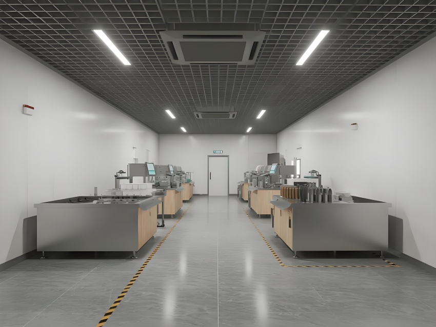 地面采用深灰色環(huán)氧防滑地坪,耐磨抗壓且易清潔;墻面使用白色抗污納米涂層鋼板,無縫拼接避免積灰;頂面設(shè)計(jì)為開放式黑色網(wǎng)格吊頂,裸露管線增強(qiáng)工業(yè)感,搭配高效LED條形燈帶提供無影照明。