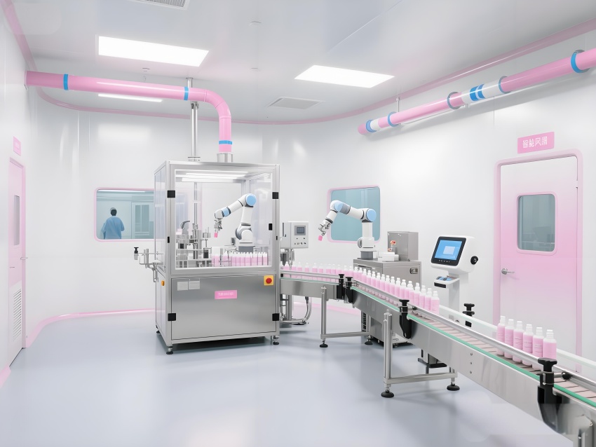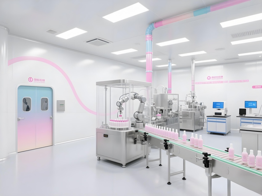本車(chē)間以“科技感純凈美學(xué)”為設(shè)計(jì)語(yǔ)言,將化妝品行業(yè)的精致基因融入工業(yè)空間。純白主色調(diào)搭配品牌標(biāo)志性的柔光粉點(diǎn)綴,墻面圓弧過(guò)渡的彩鋼板與地面淺灰導(dǎo)靜電地板構(gòu)成潔凈基底。核心灌裝區(qū)透明層流罩內(nèi),機(jī)械臂精準(zhǔn)抓取瓶體灌裝,冷銀色設(shè)備與粉色功能標(biāo)識(shí)形成視覺(jué)對(duì)比。頂棚均勻分布的LED平板燈在乳化區(qū)投下無(wú)影光效,原料輸送管道通過(guò)色環(huán)編碼清晰區(qū)分。質(zhì)檢實(shí)驗(yàn)室的藍(lán)光檢測(cè)儀與包裝區(qū)高速傳送帶上的產(chǎn)品流,共同構(gòu)建高效生產(chǎn)韻律。人員通道的智能風(fēng)淋室采用漸變色玻璃,科技感與人性化并存。整體空間通過(guò)嚴(yán)格的功能分區(qū)與柔和的色彩管理,打造符合國(guó)際標(biāo)準(zhǔn)的化妝品智造殿堂。