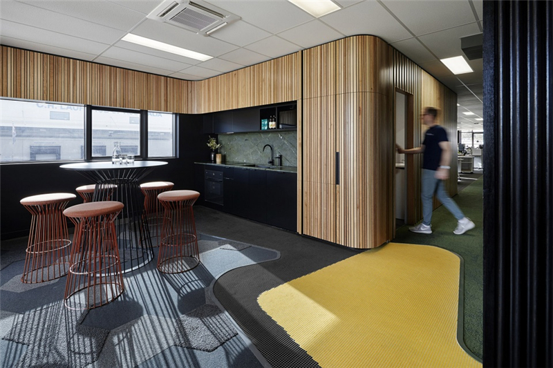 多彩的線條從附近的自然保護區一直延伸到位于生產區核心地帶的巨型壁畫上,吸引著員工和參觀工廠的訪客。產自本地的澳洲硬木和紋理豐富的墻面從外部景觀“流進”室內,在自然光線的配合下營造出富有生機的氛圍。