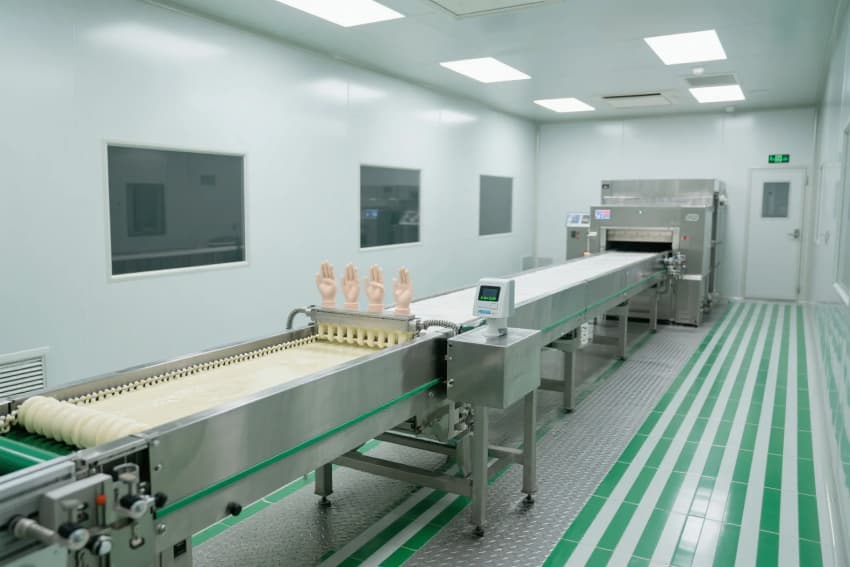 ?本醫(yī)用手套車間采用"原料-成型-硫化-包裝"全封閉流水線設計,核心浸漬區(qū)維持Class100,000級潔凈環(huán)境,配備22米恒溫鏈式烘道確保硫化均勻性。原料處理采用氮氣保護系統(tǒng)防止乳膠變質,智能化浸漬槽通過PID控制實現(xiàn)膜厚公差±0.01mm。特色設計包括:1)手模自動檢測系統(tǒng)(AI識別缺損)2)熱能回收裝置(節(jié)能30%)3)雙通道EO滅菌(F0≥15)。安全體系實現(xiàn):1)氨氣濃度實時報警2)應急電源0.5秒切換3)廢水預處理(pH6-8)。質檢區(qū)配備全自動針孔檢測儀與生物負載測試設備,確保產(chǎn)品符合FDA510(k)標準。車間通過模塊化布局可實現(xiàn)日產(chǎn)50萬副醫(yī)用檢查手套,材料利用率達98.5%。